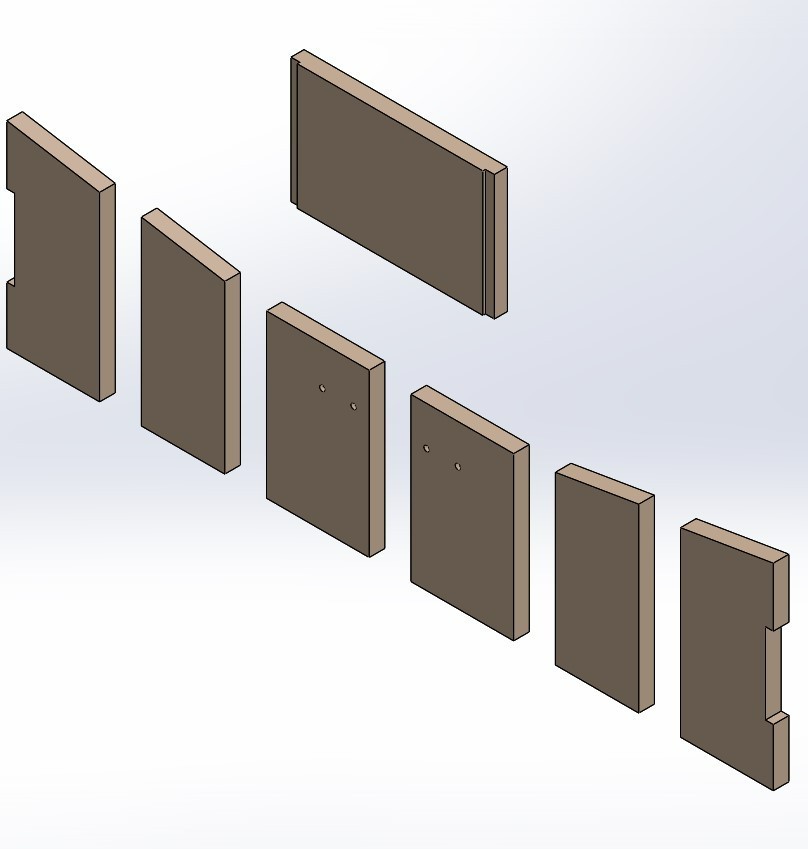 Maße: Material Vermiculite Seitenstein links vorne (177 x 349/378 x 30 mm), Seitenstein links hinten (160 x 320/347 x 30 mm) Seitenstein rechts vorne (177 x 349/378 x 30 mm), Seitenstein rechts hinten (160 x 320/347 x 30 mm) gelochter Rückwandstein links (197 x 311 x 30 mm), gelochter Rückwandstein rechts (197 x 311 x 30 mm) Zugumlenkung (385 x 238 x 35 mm)