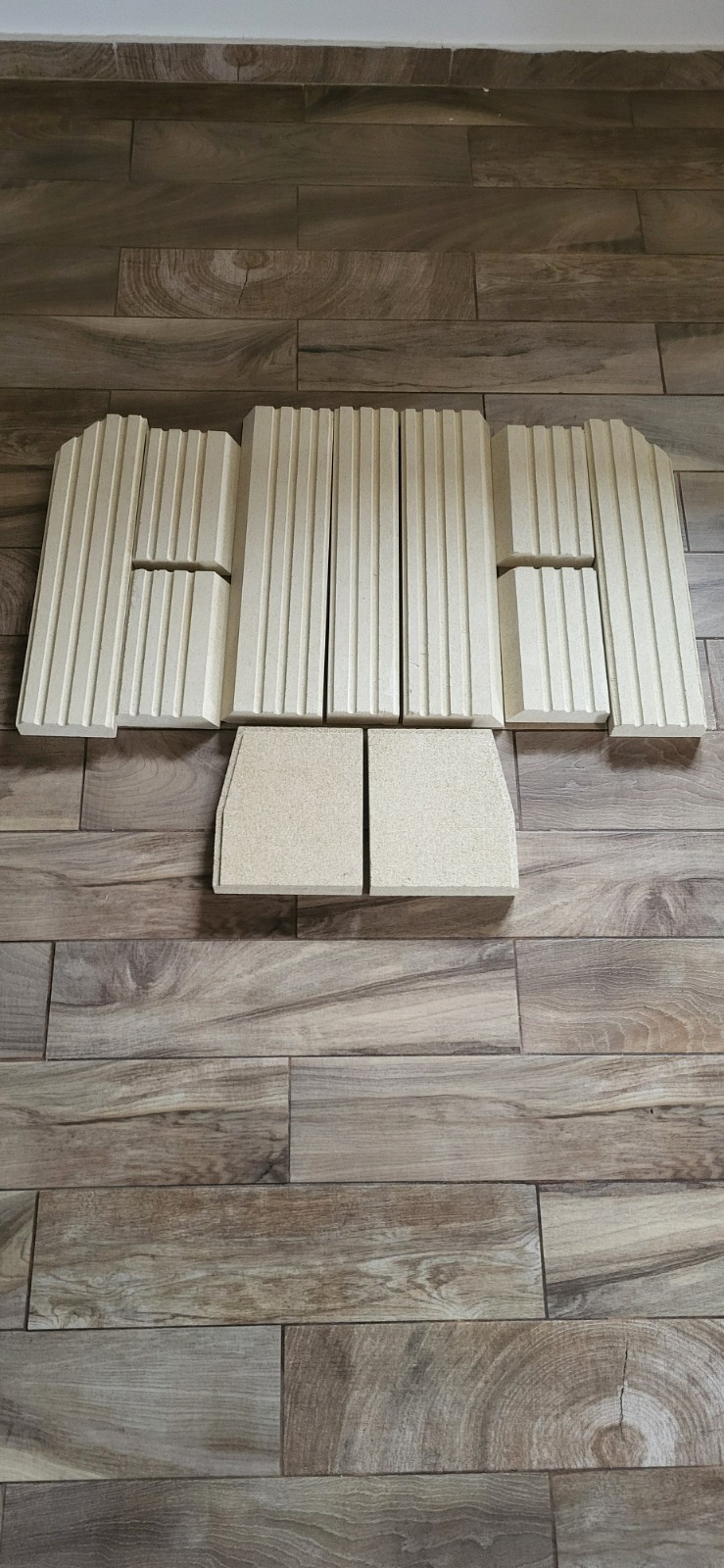 Maße: Material Schamotte Seitenstein links vorne (135 x 545 x 40 mm) Seitenstein rechts vorne (135 x 545 x 40 mm) Seitenstein links mitte oben (147 x 241 x 40 mm) Seitenstein rechts mitte oben (147 x 241 x 410 mm) Seitenstein links mitte unten (147 x 241 x 410 mm) Seitenstein rechts mitte unten (147 x 241 x 410 mm)) Rückwandstein links (147 x 545 x 40 mm) Rückwandstein mitte (103 x 545 x 40 mm) Rückwandstein rechts (147 x 545 x 40 mm) Bodenstein links (175/200 x 235 x 40 mm) Bodenstein rechts (175/200 x 235 x 40 mm)